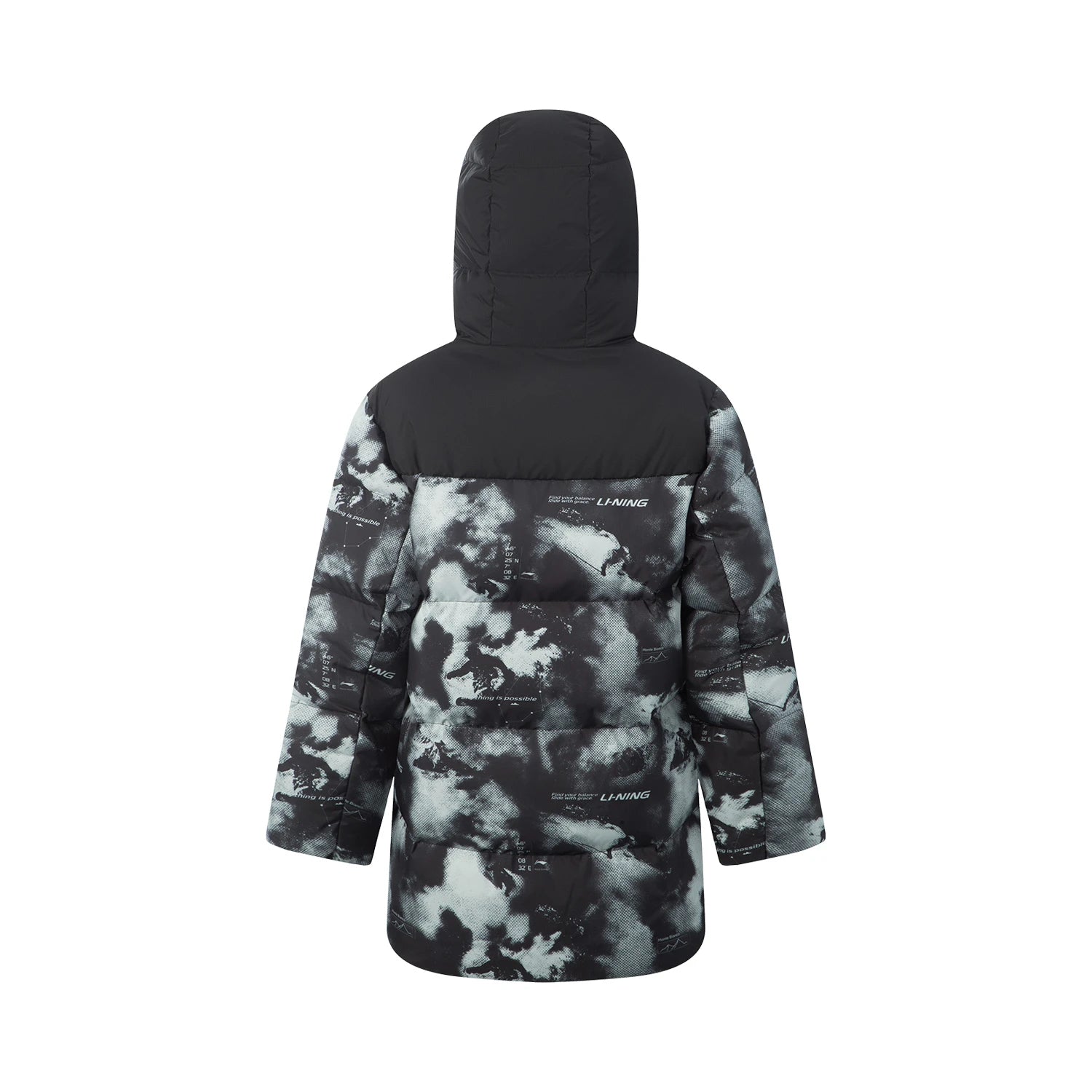 Длинный детский пуховик с капюшоном и сплошным графическим принтом, выполненный из водоотталкивающей ткани. Модель свободного кроя наполнена утиным пухом, обеспечивая тепло, комфорт и современный дизайн.