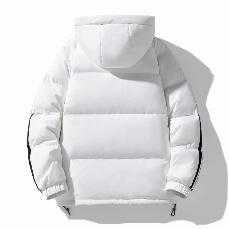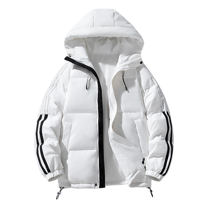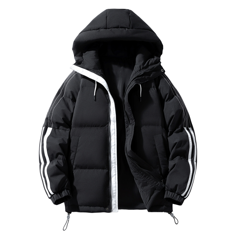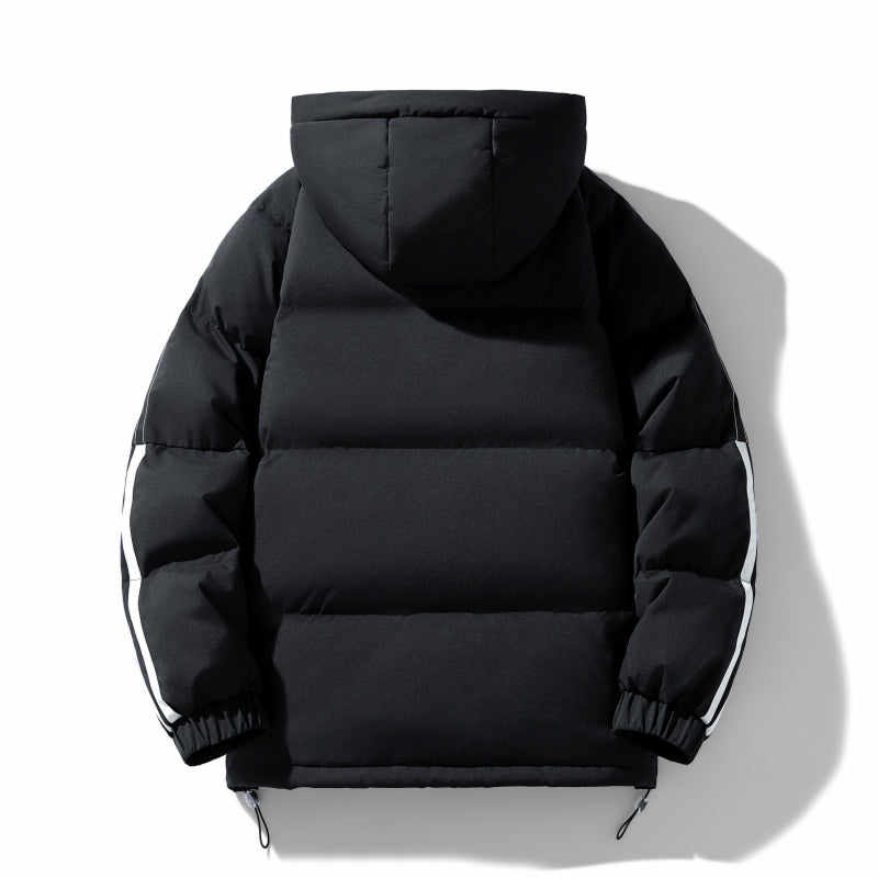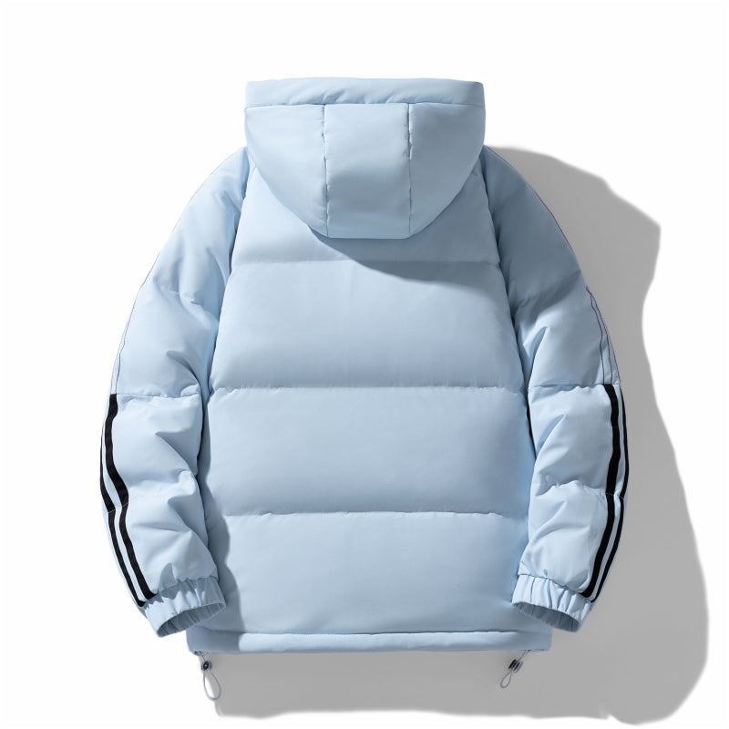 Пуховик в американском стиле с несъемным капюшоном и полосками для мальчиков школьного возраста. Модель свободного кроя наполнена утиным пухом, обеспечивая тепло, комфорт и современный образ для учебы и отдыха.