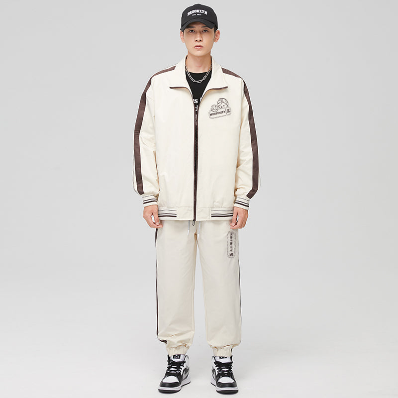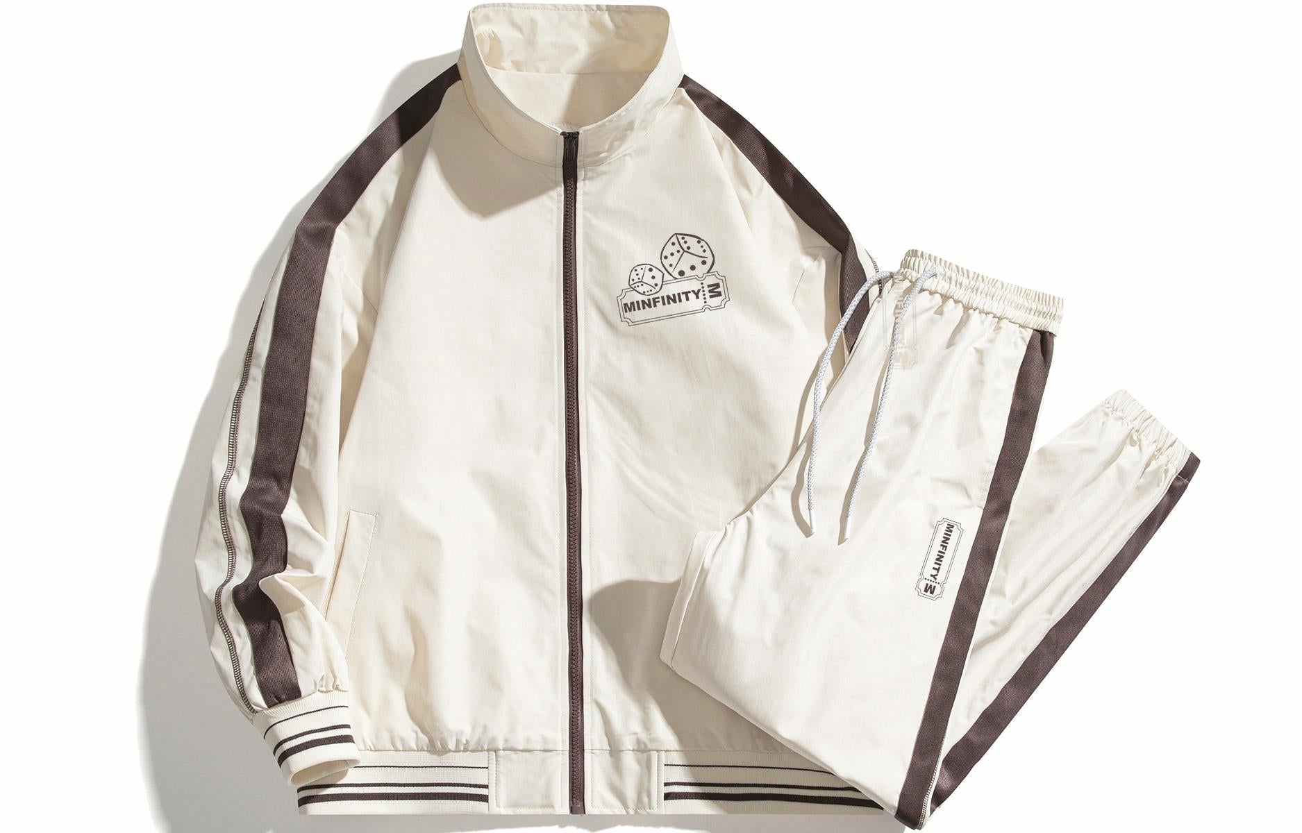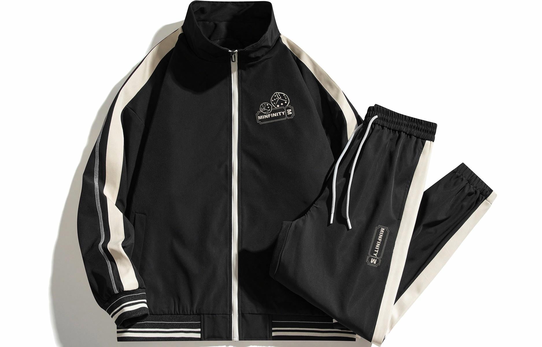 Zamonaviy Minfinity sport kostyumi retro, sport uslubida yaratilgan. U tik turgan yoqali va uzun yengli fermuarli kurtka hamda keng, tortma ipli sport shimlarini o'z ichiga oladi. Dizayn zar shaklidagi bosma, yozuvlar va qarama-qarshi panelli simmetrik chiziqlarga ega. Bo'shashgan o'lcham va elastik belbog' qulaylik va ko'p qirralilikni ta'minlaydi.