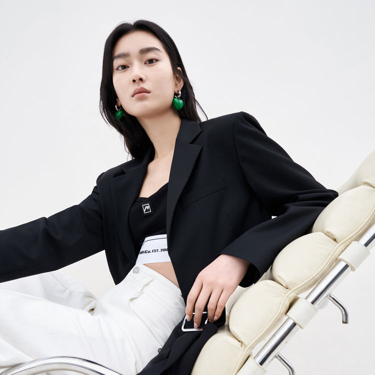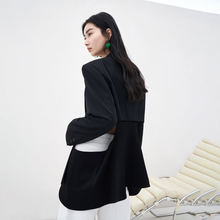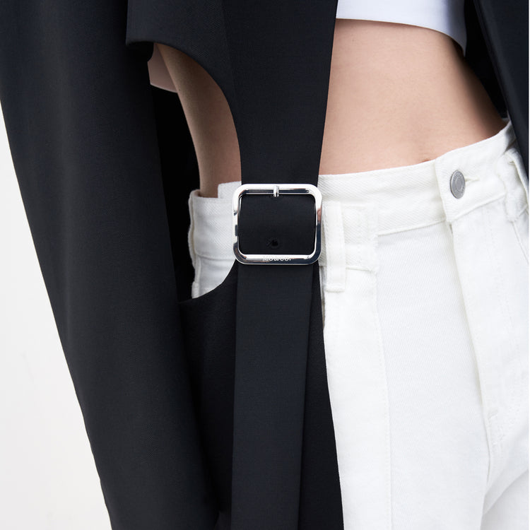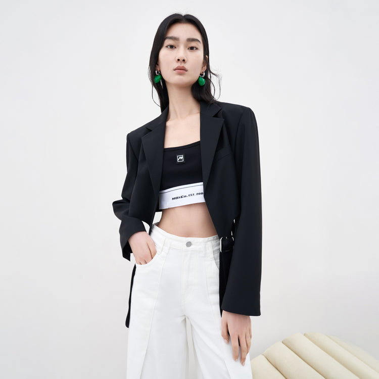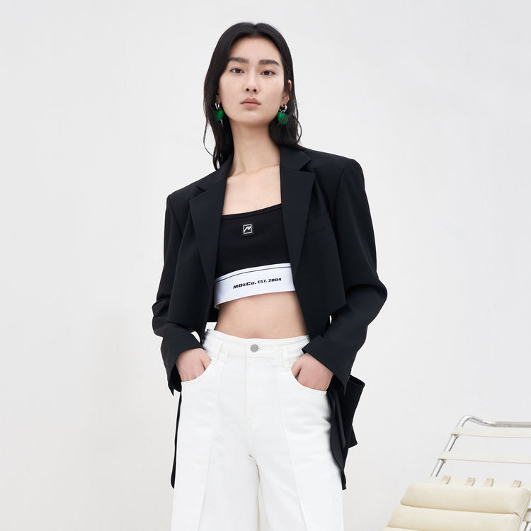 Moco dekonstruksiya qilingan dizayndagi yuqori belli kesilgan metall tugmali keng yelkali blazer ayollar qora