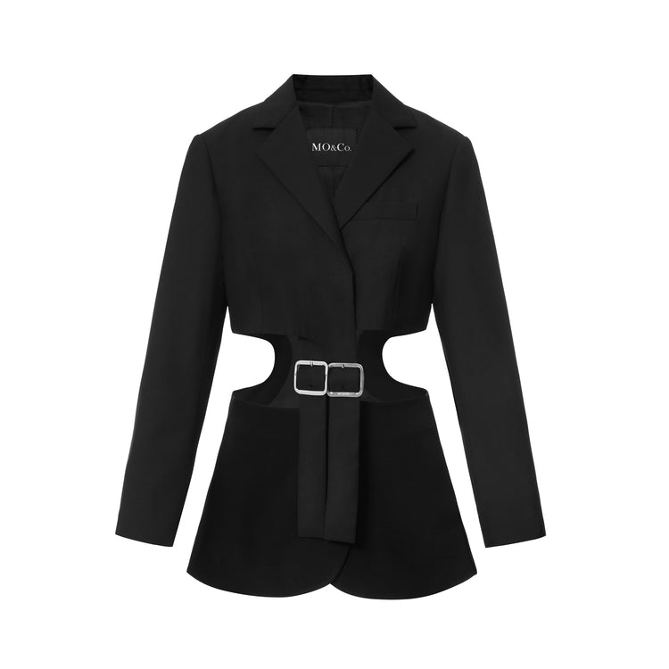 Женский жакет с акцентными широкими плечами и деконструированным вырезом на талии, выполненный из плотной смесовой ткани с добавлением шерсти, создаёт выразительный силуэт для fashion-образов. Металлический декор добавляет минималистичный акцент.