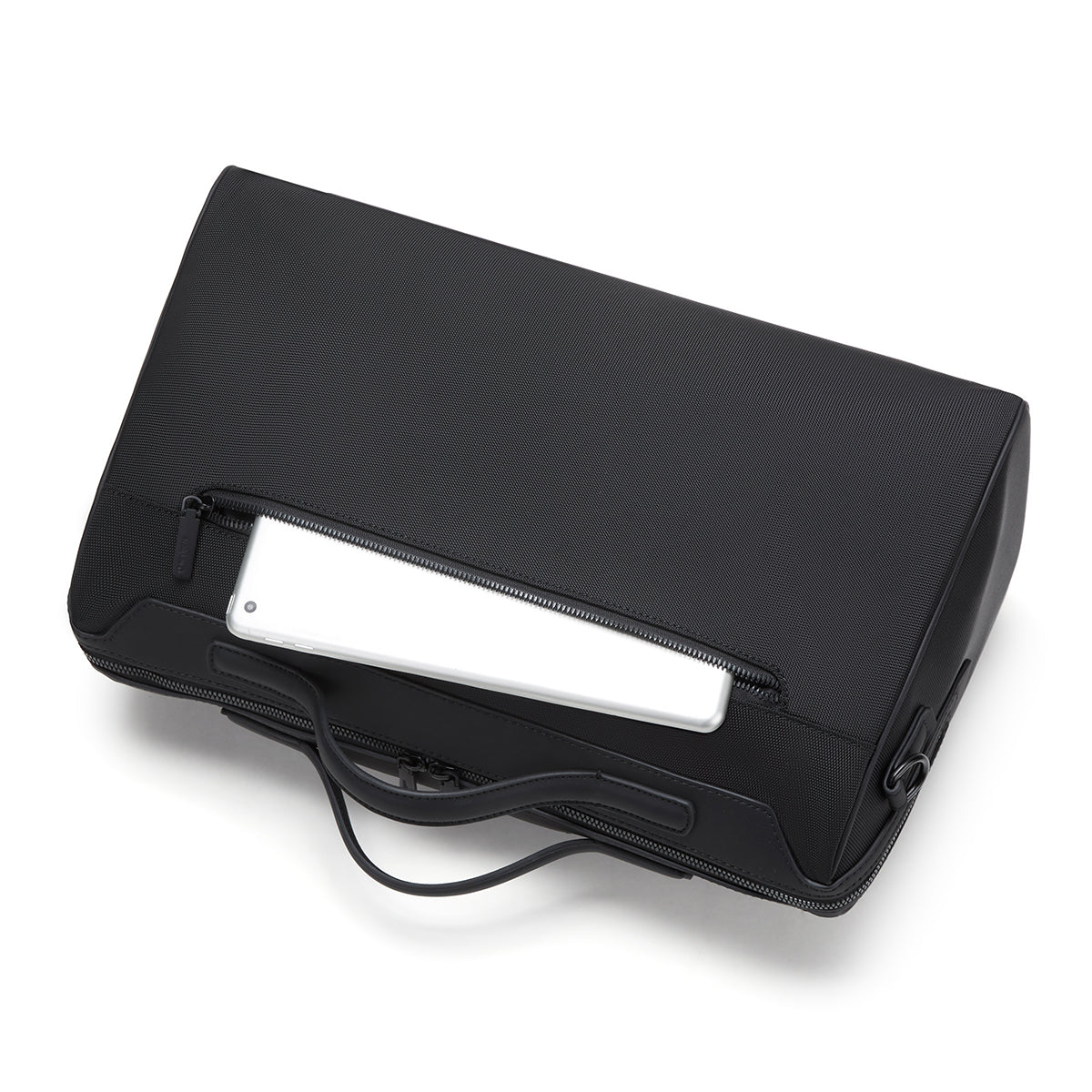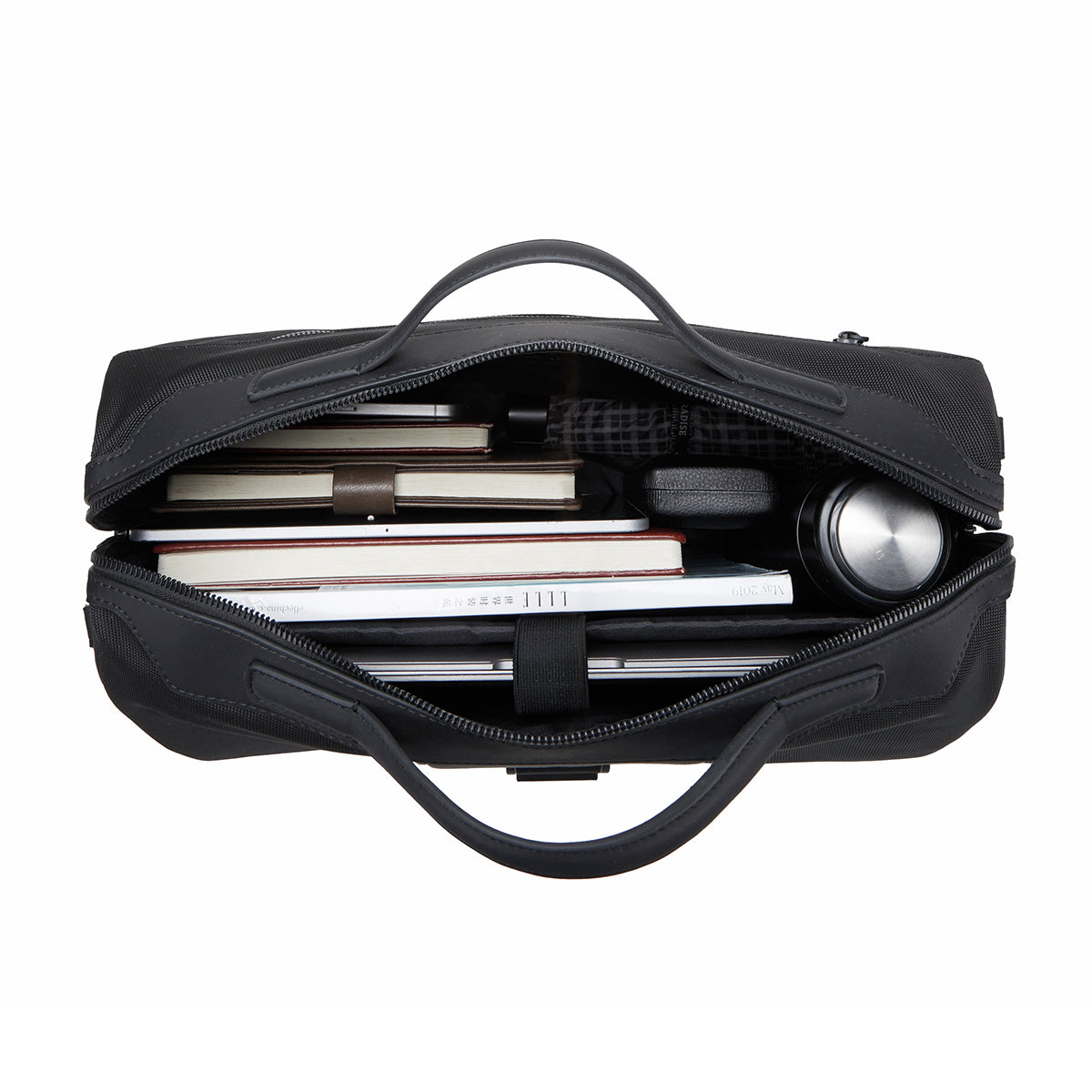 Ish va sayohat uchun mo'ljallangan, sun'iy charm va mato kombinatsiyasidan tayyorlangan funktsional sumka. Unda noutbuk bo'limi, ichki fermuarli cho'ntaklar va qo'lda yoki yelkada ko'tarish uchun qulay tutqich mavjud.