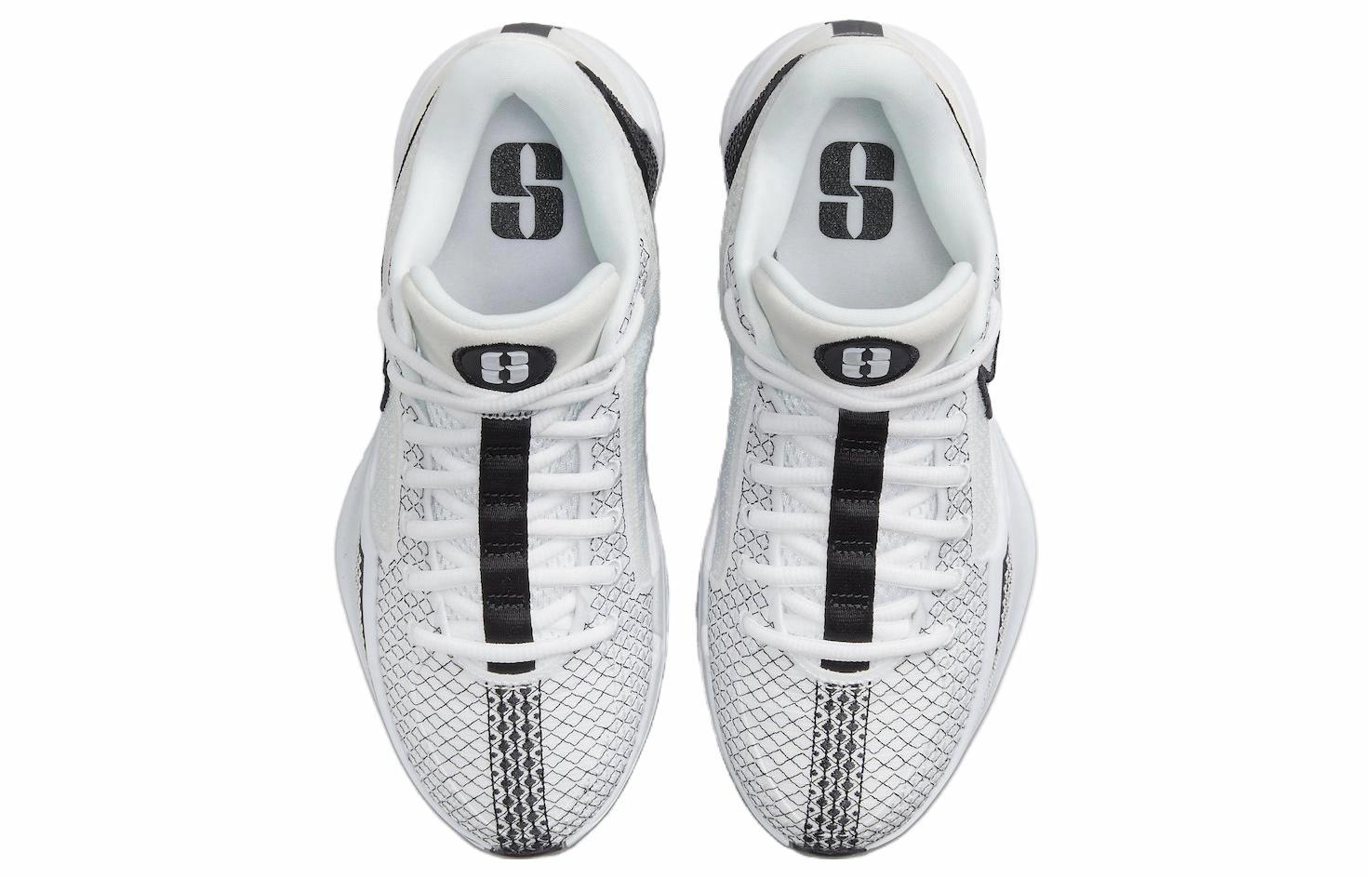 Oq va qora ranglarda tikilgan dumaloq burunli va bog'ichli basketbol poyabzali. Ushbu past profilli model ajoyib qo'llab-quvvatlash va zamonaviy ko'rinishni ta'minlab, kortda qulay o'ynash uchun mo'ljallangan.