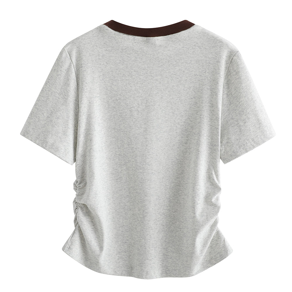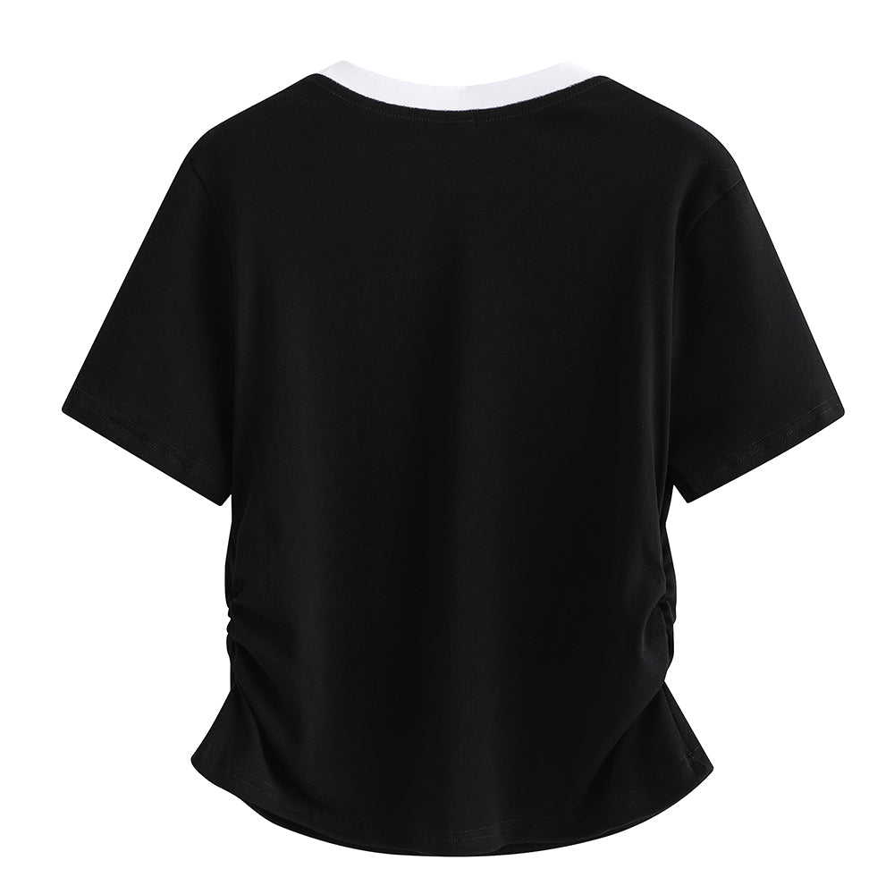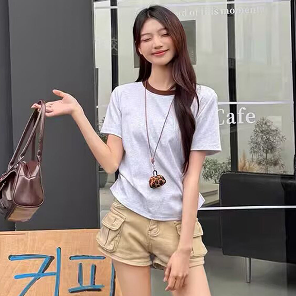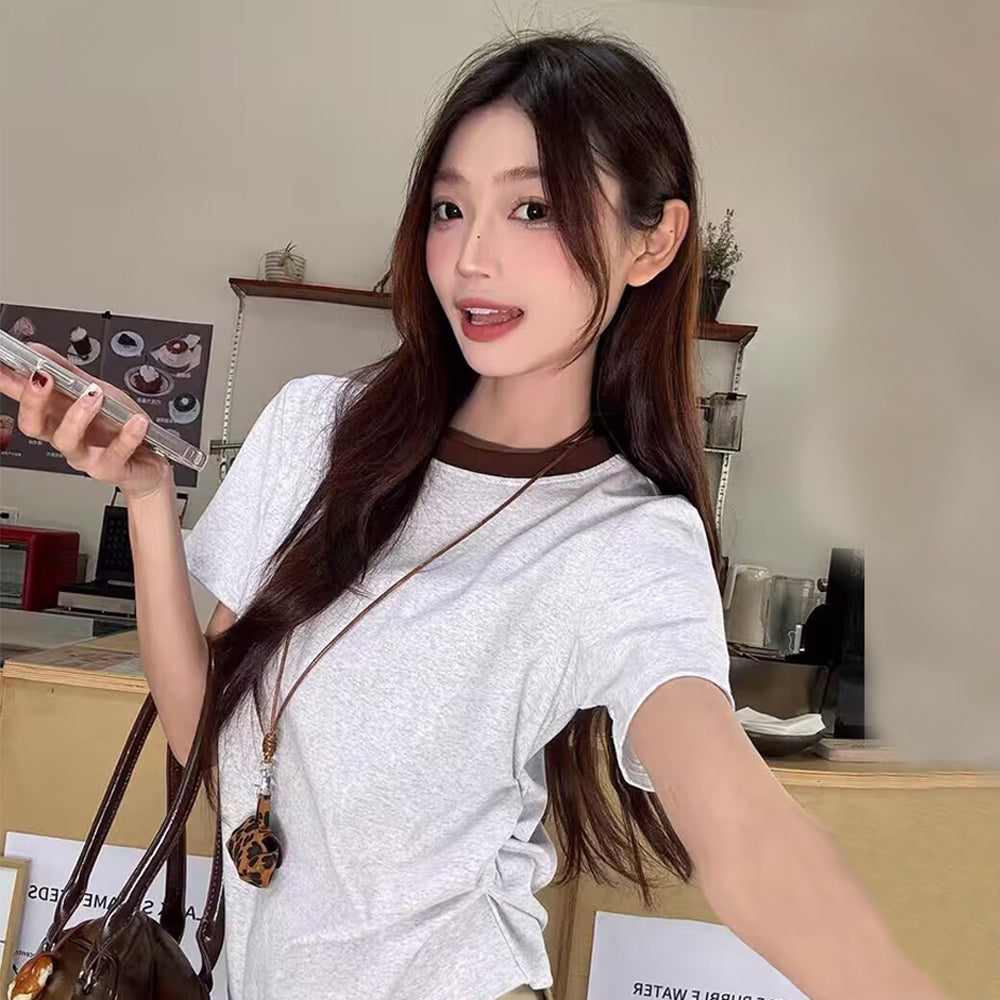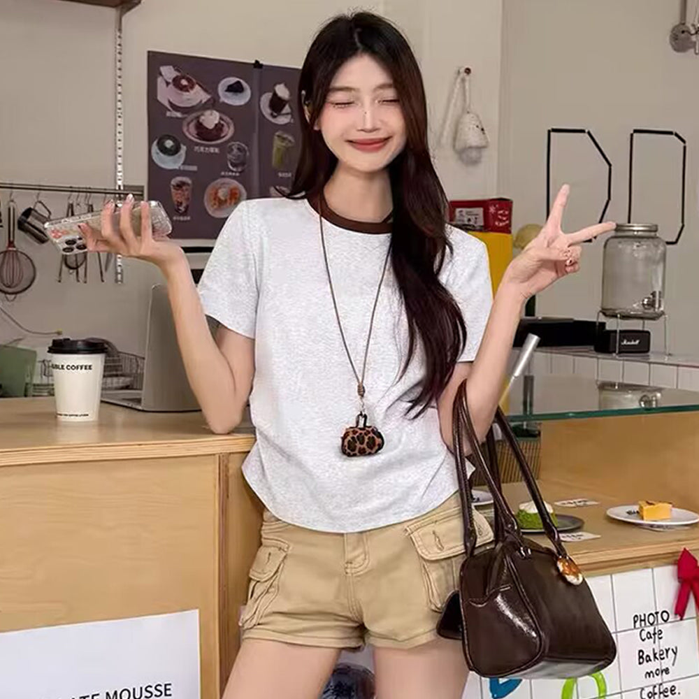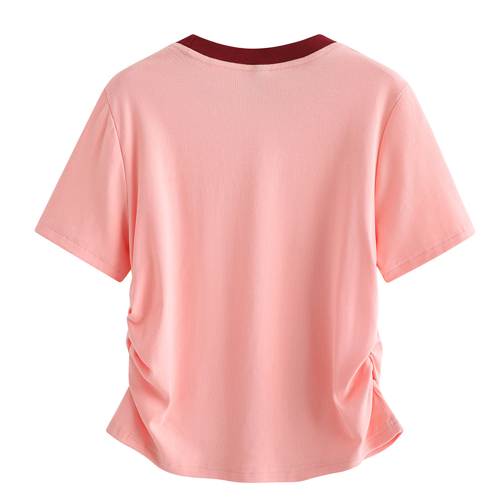 Pal ongaco pal ongaco Amerika ins trend to'qnashuvi qovurg'ali yoqa cho'zilgan bel nozik nozik shirin chili qisqa ekipaj bo'yinli qisqa yengli futbolka ayollar