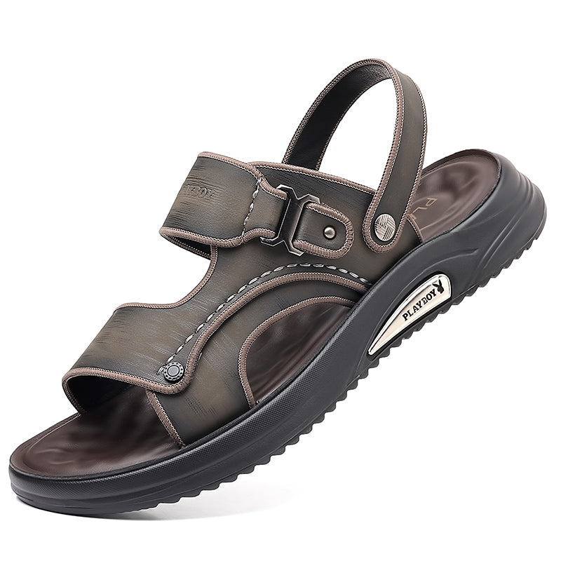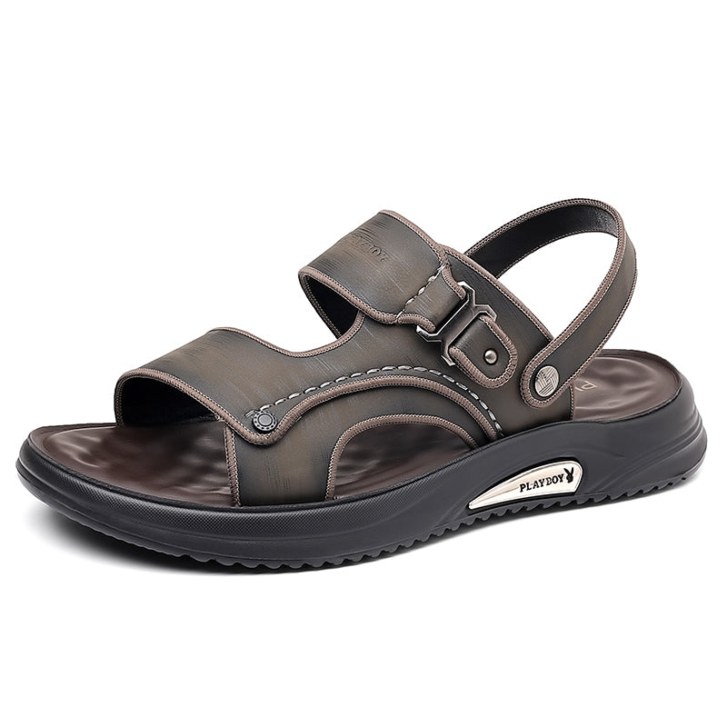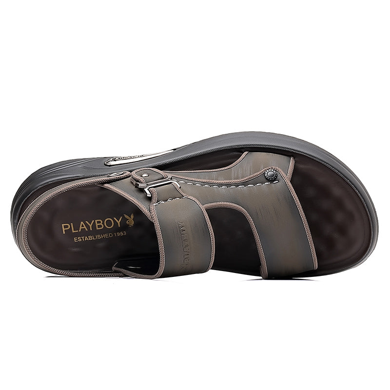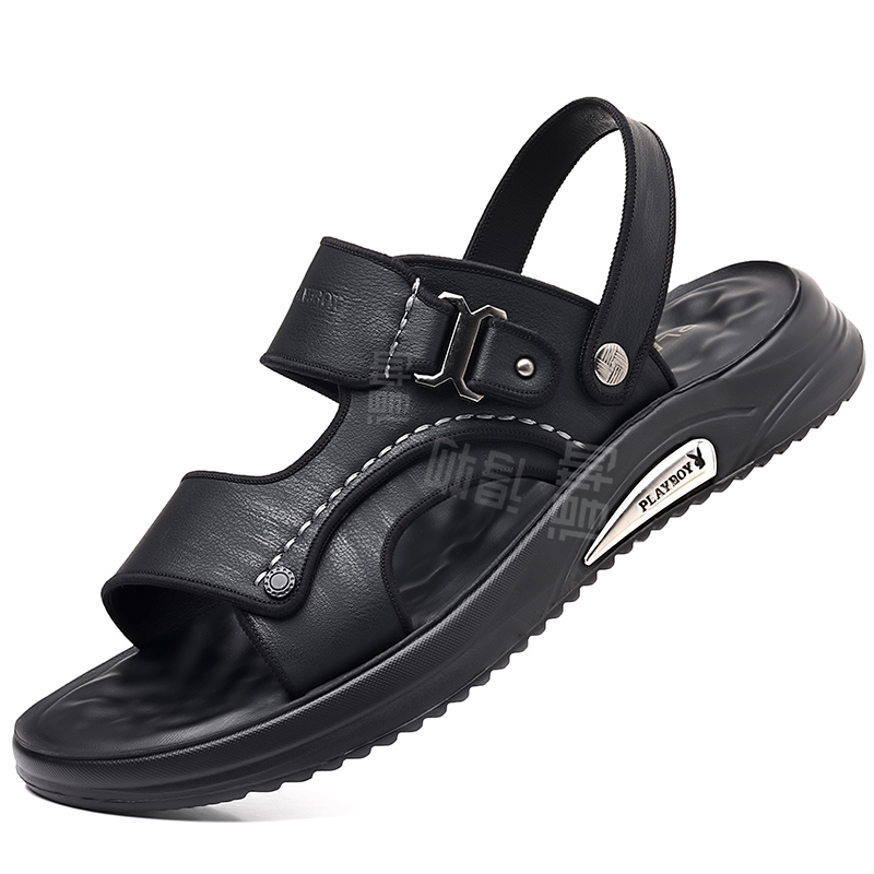 Ikki qavatli sigir terisidan tikilgan erkaklar uchun Playboy plyaj sandallari. Bir marta tortiladigan konstruksiyaga ega oddiy va qulay ochiq oyoqli dizayn. Poliuretan tagligi yengil qulaylik va barqarorlikni ta'minlaydi. Bahor, yoz va kuz uchun mos.