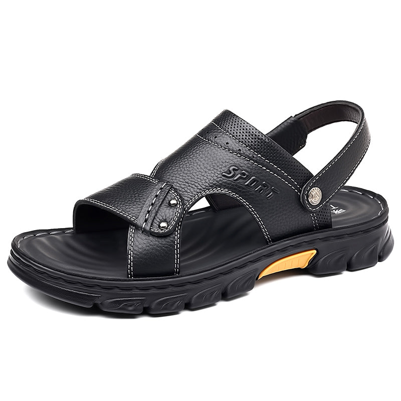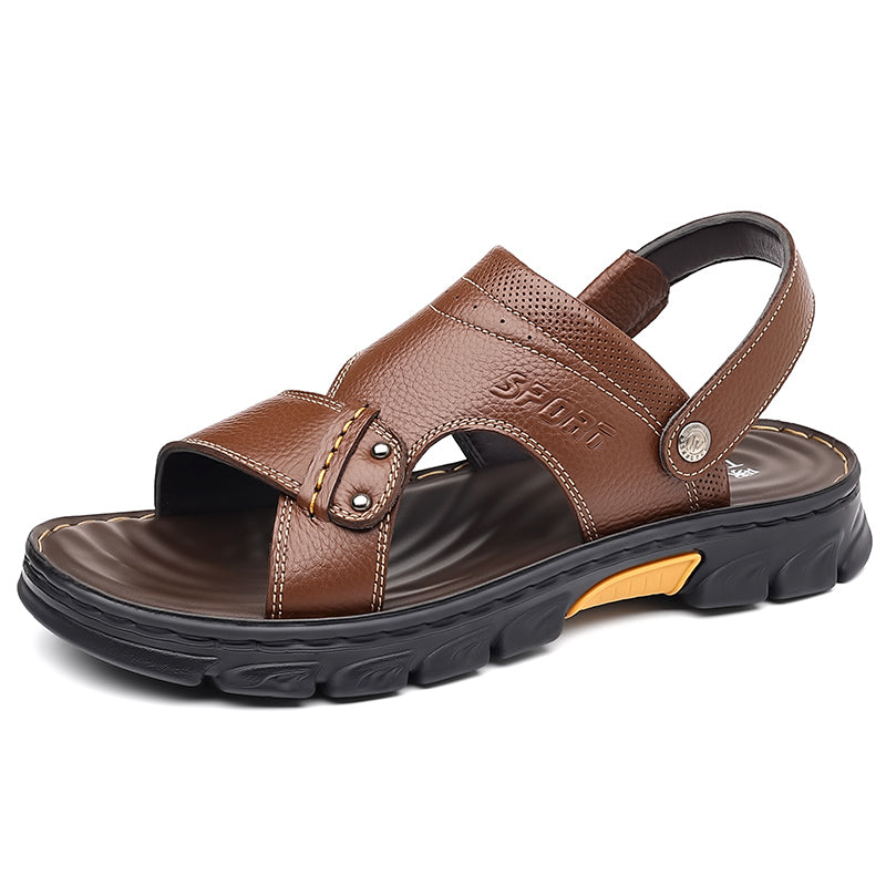 Yuqori sifatli charmdan tayyorlangan amaliy va zamonaviy ochiq uchli plyaj sandallari. Ushbu sirpanmaydigan, o'rtacha balandlikdagi poliuretan tagliklarni kiyish oson va yozgi dam olish uchun juda mos keladi.