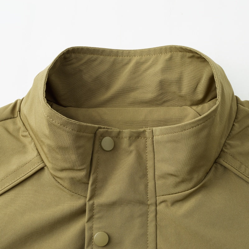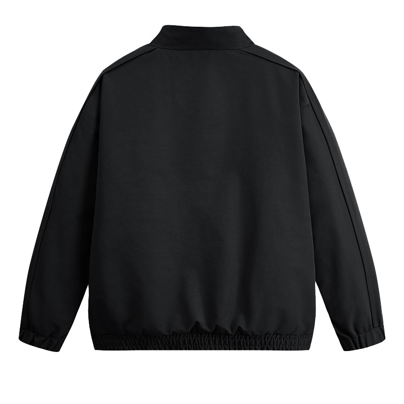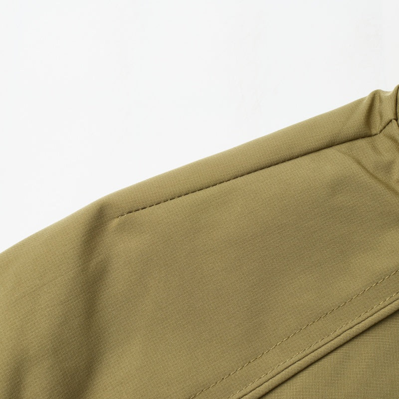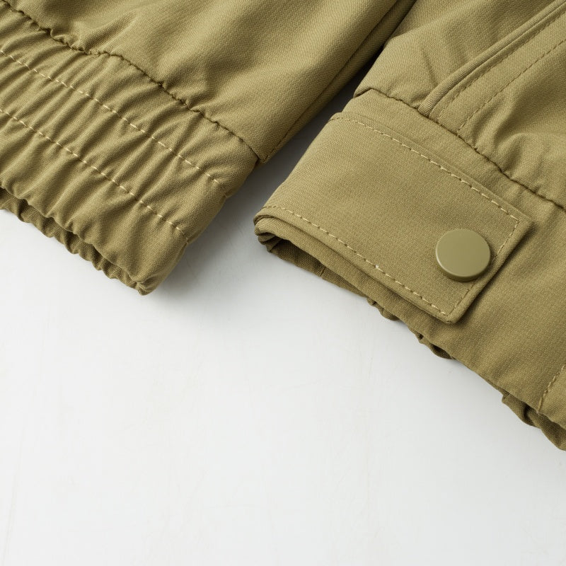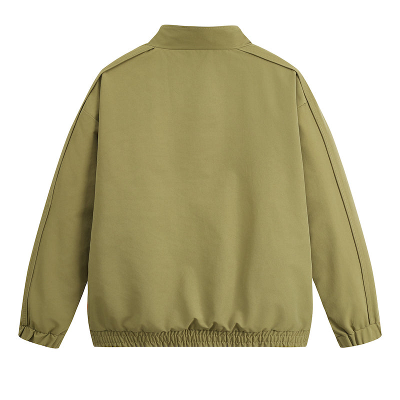 Silliq poliesterdan tayyorlangan, tik turgan yoqali va raglan shaklidagi, erkin shakldagi aviator uslubidagi kurtka. Ushbu minimalist, tekis kesilgan, fermuarli kurtka kundalik ko'p qatlamli ko'rinish yaratish uchun juda mos keladi.