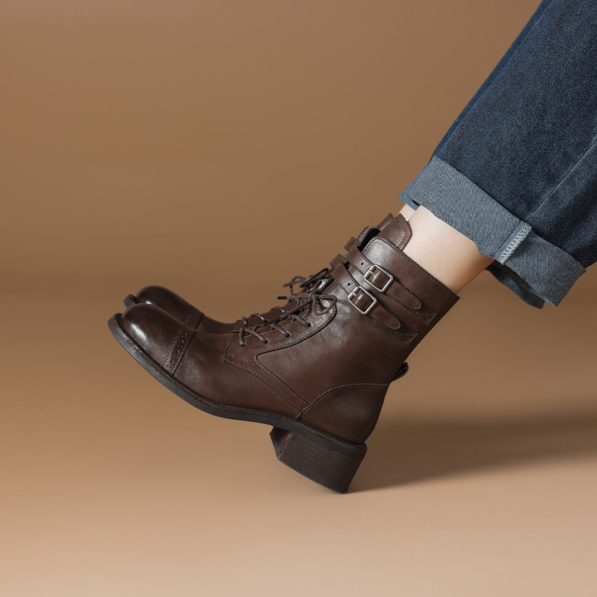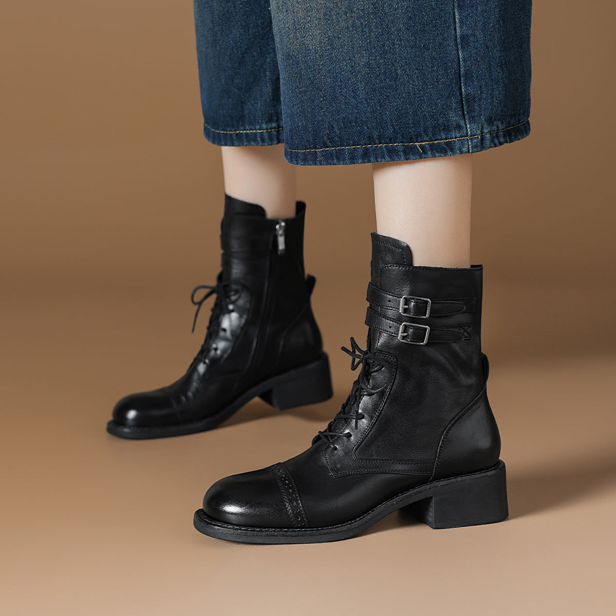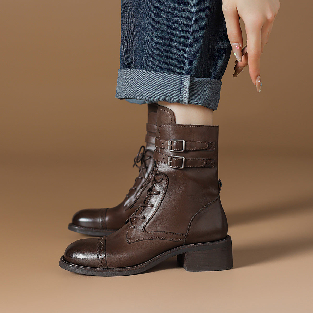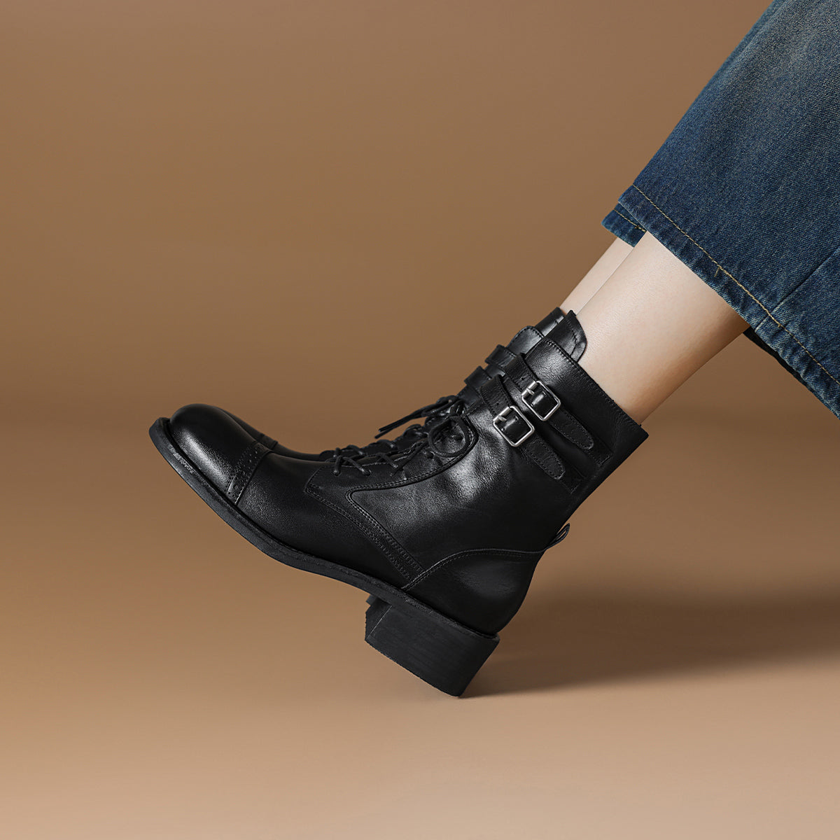 Dekorativ qisqichli va 15,5 sm balandlikdagi milya bilan vintage sigir terisi biker martinlari. 4,5 sm uzunlikdagi tovon kundalik kiyish uchun qulaylik va zamonaviy ko'rinish beradi.