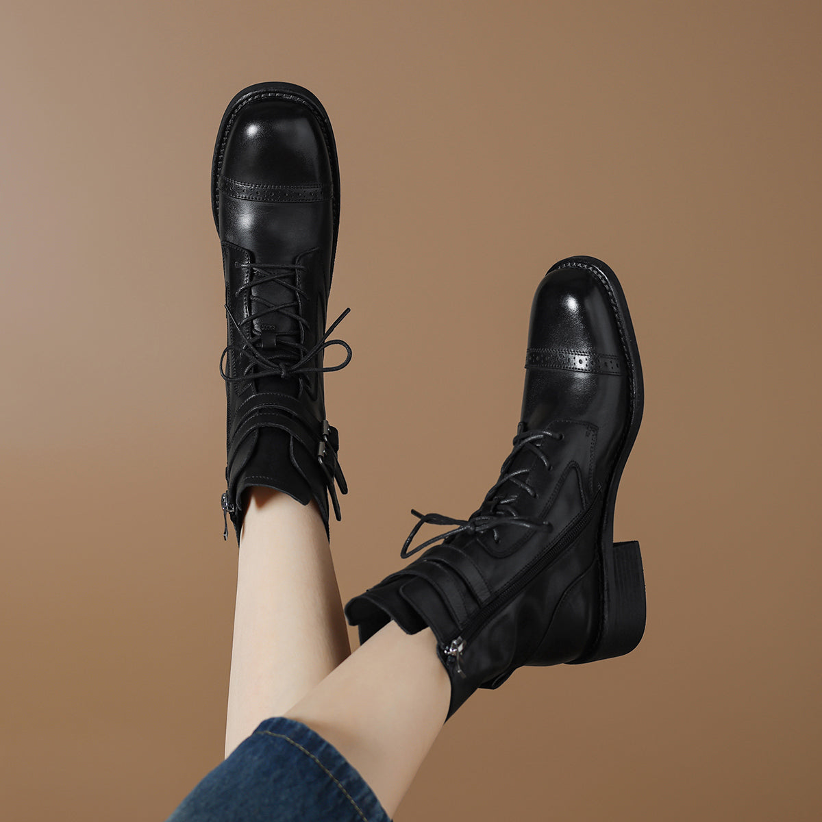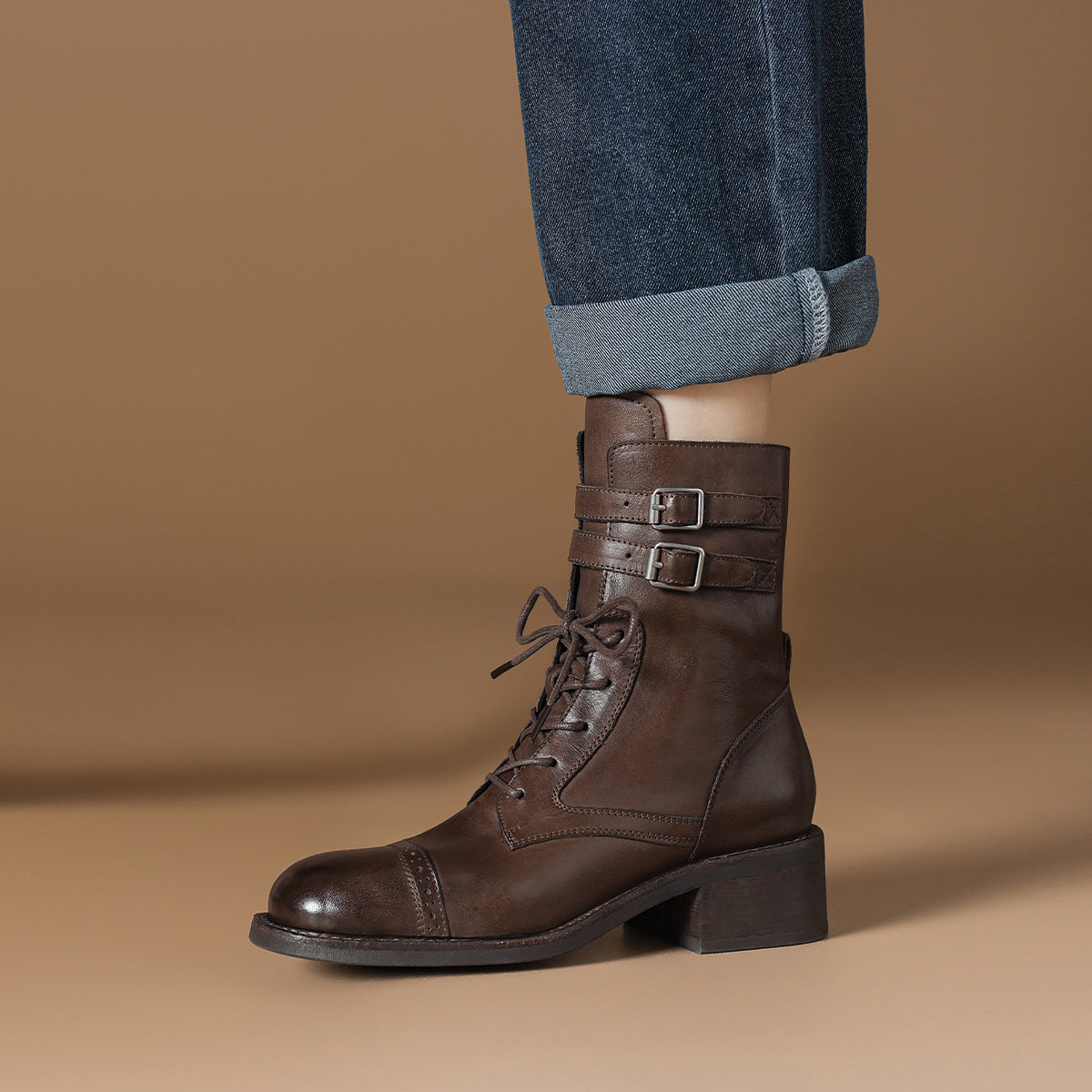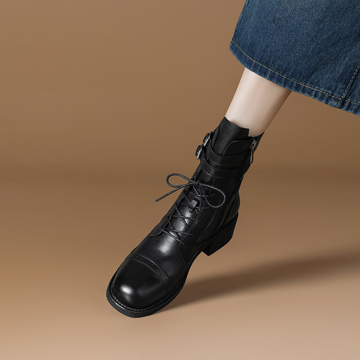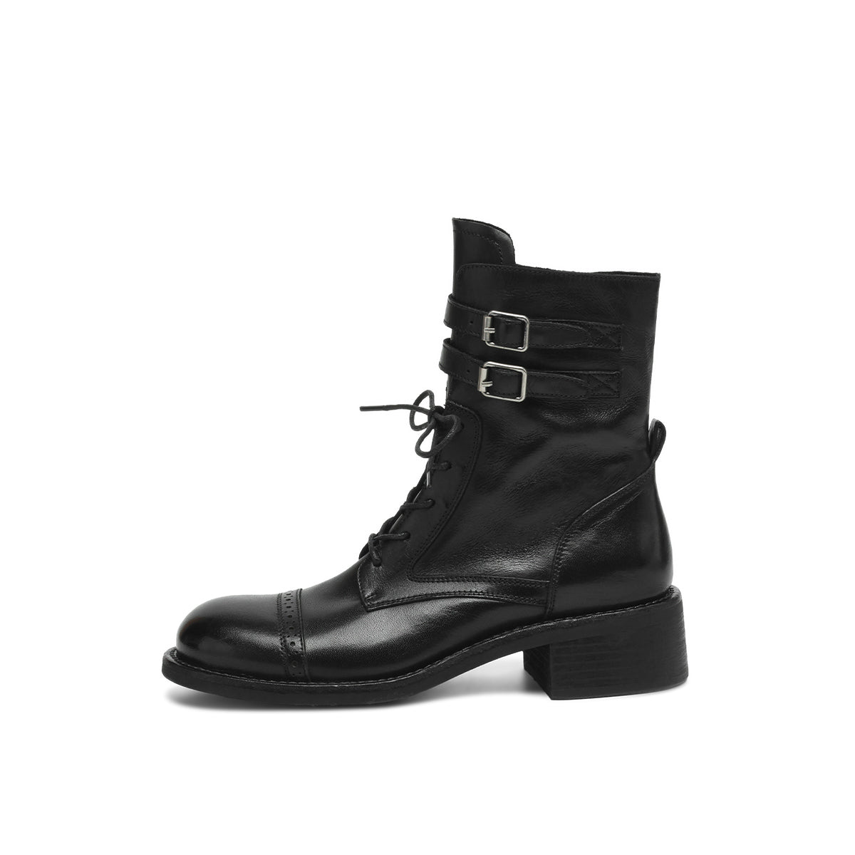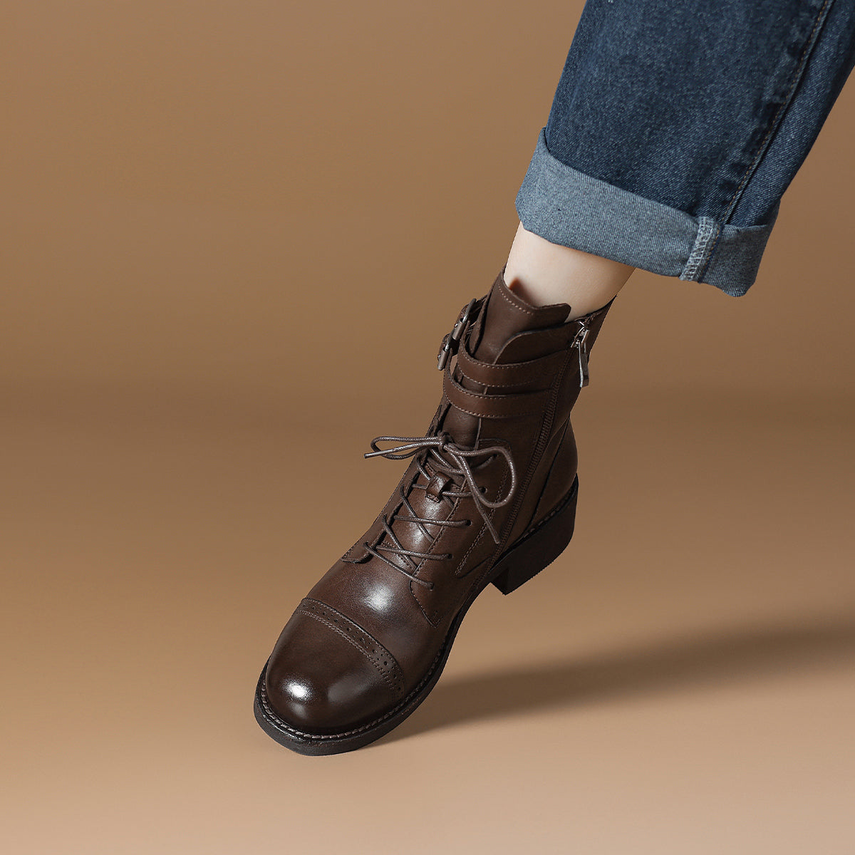 Dekorativ qisqichli va 15,5 sm balandlikdagi milya bilan vintage sigir terisi biker martinlari. 4,5 sm uzunlikdagi tovon kundalik kiyish uchun qulaylik va zamonaviy ko'rinish beradi.
