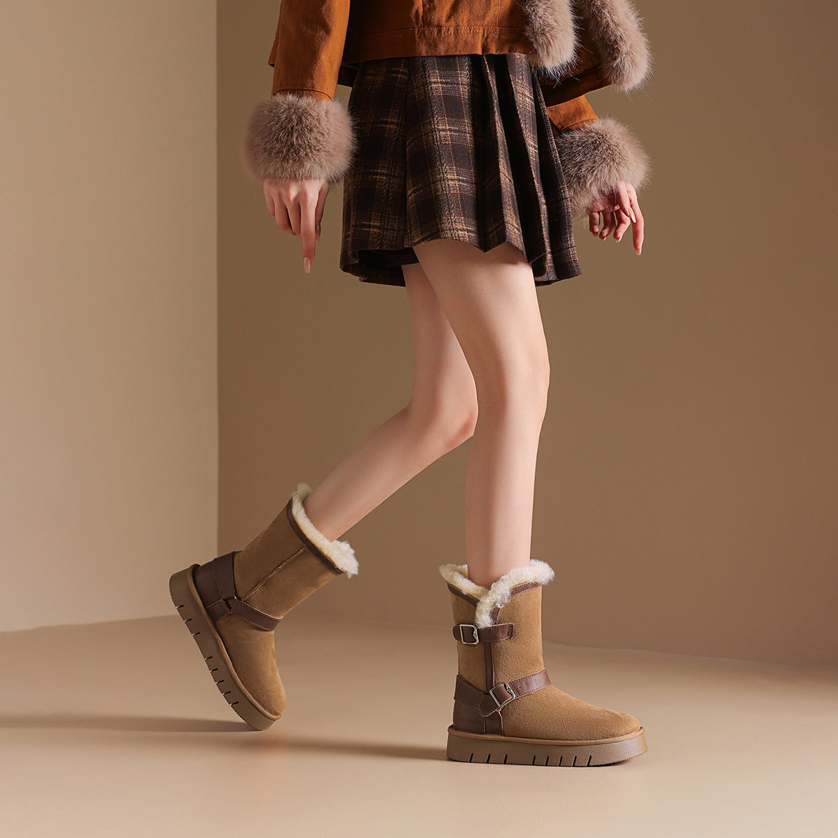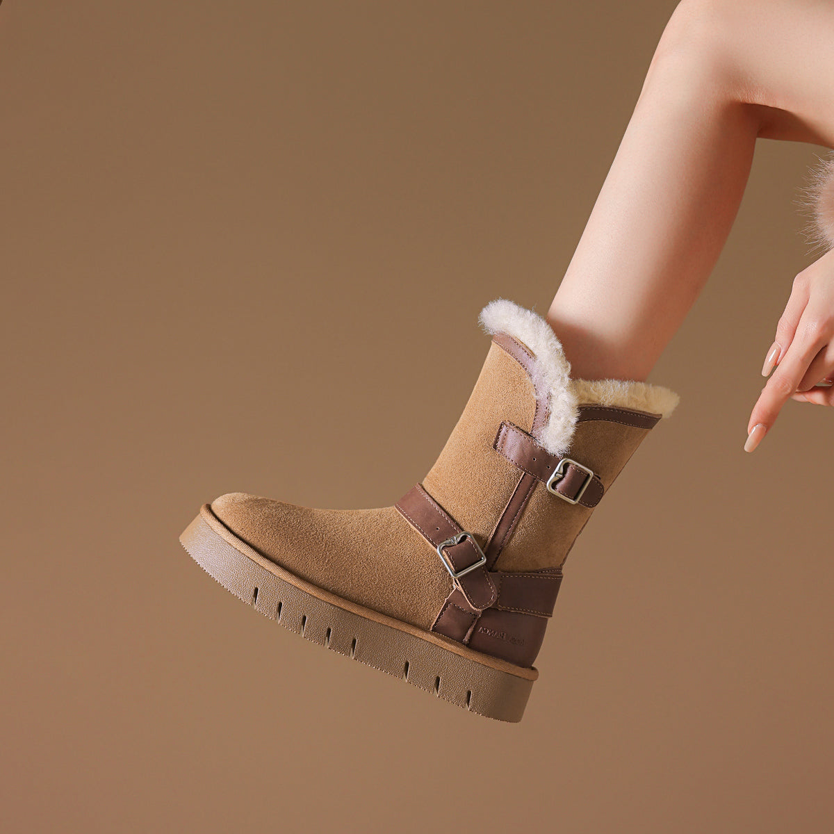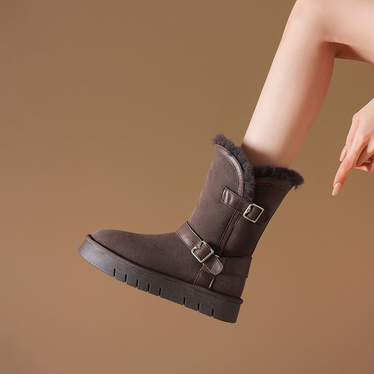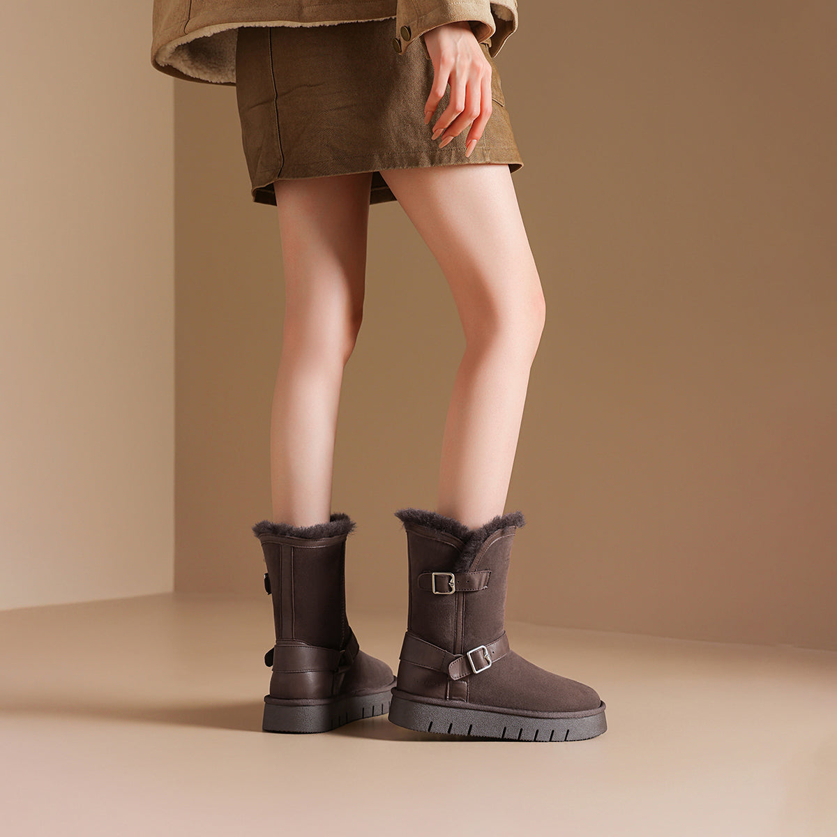 Qo'y va teridan tikilgan, qalin taglikli, retro dizayndagi issiq, kalta oyoq bilakchalari. Ular qulaylik va sovuqdan himoya qiladi, qish mavsumi uchun juda mos keladi.