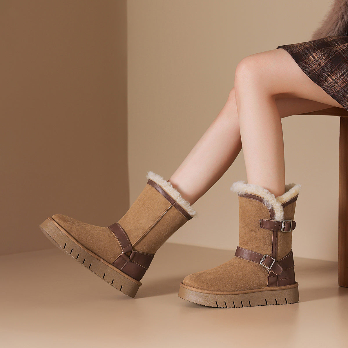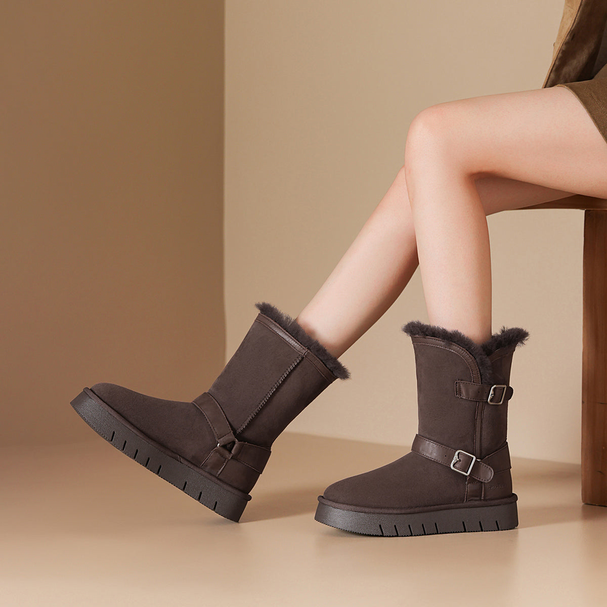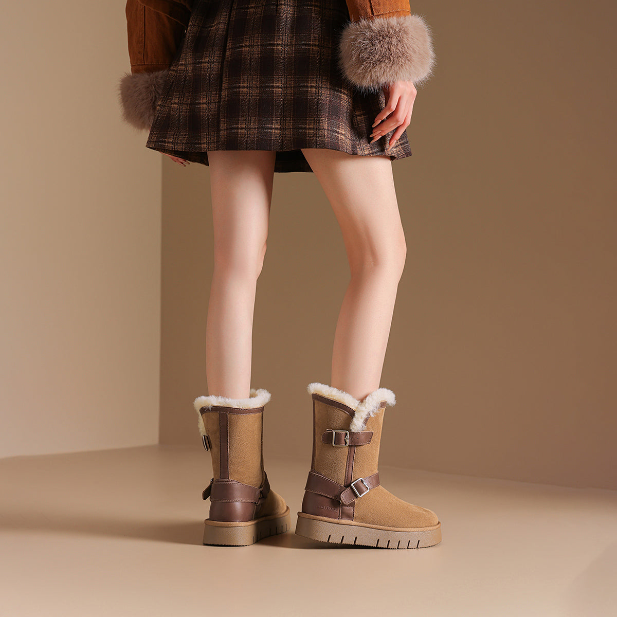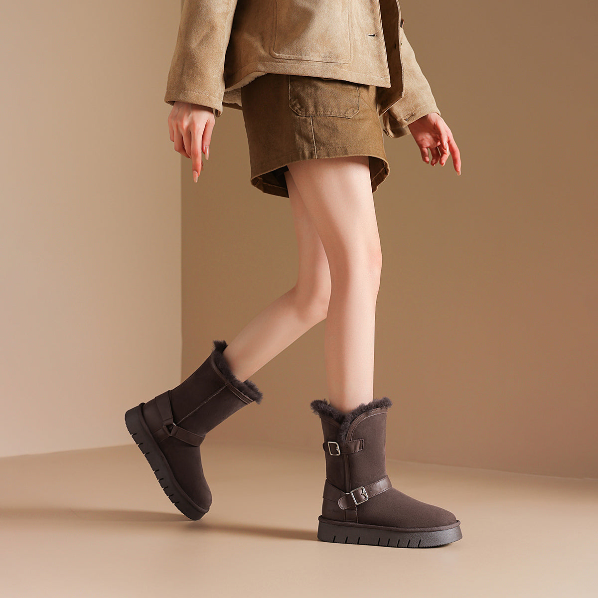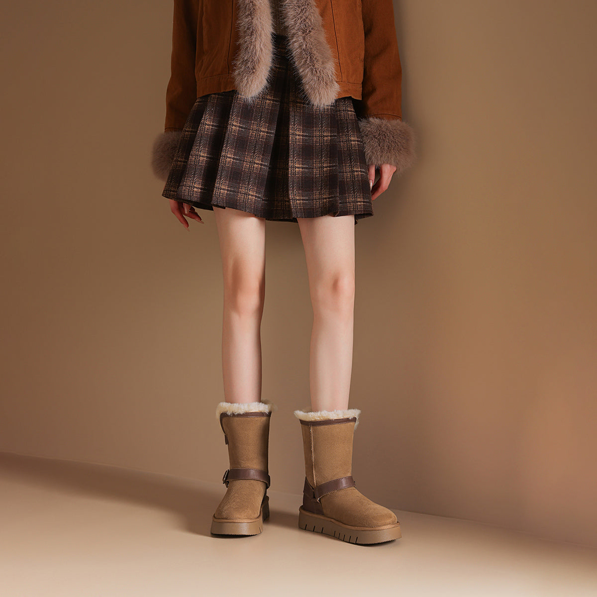 Qo'y va teridan tikilgan, qalin taglikli, retro dizayndagi issiq, kalta oyoq bilakchalari. Ular qulaylik va sovuqdan himoya qiladi, qish mavsumi uchun juda mos keladi.
