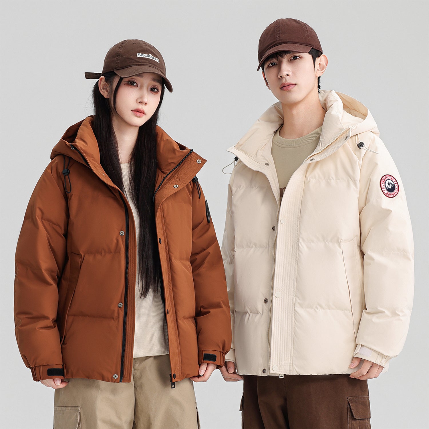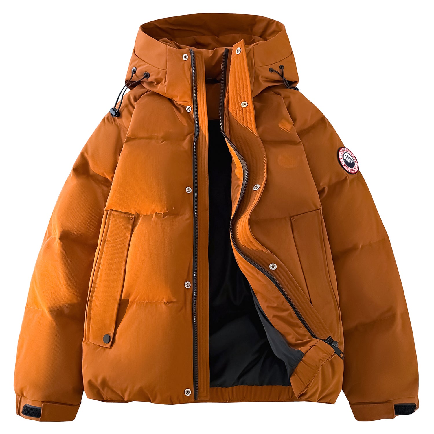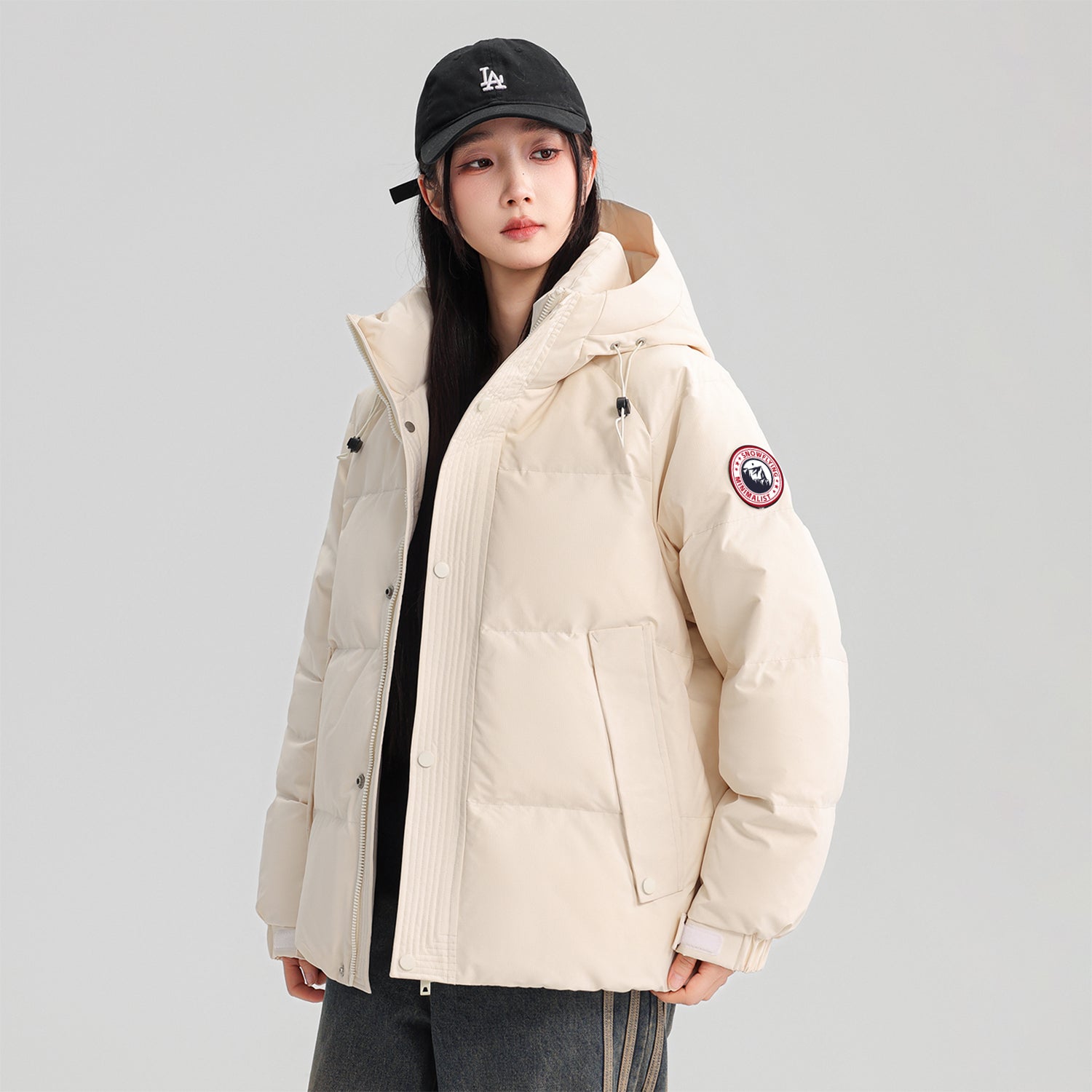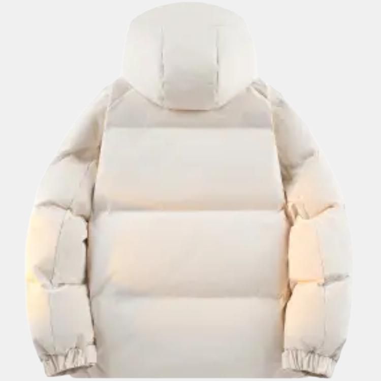 Пуховик в американском уличном стиле с капюшоном на регулируемых шнурках и манжетами на липучках, украшенный тематическим принтом «ледники». Модель свободного кроя наполнена утиным пухом высокой очистки, обеспечивая тепло и защиту от вылезания наполнителя.