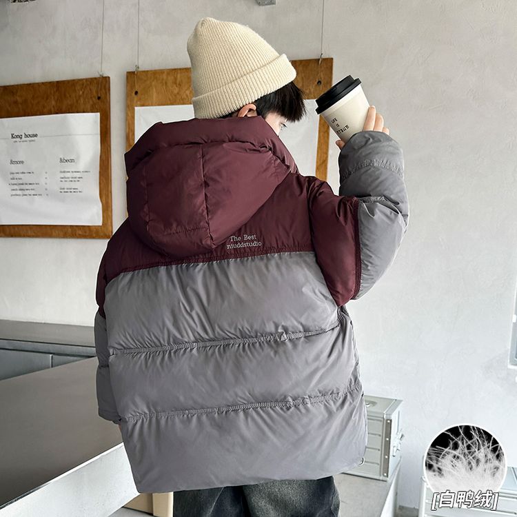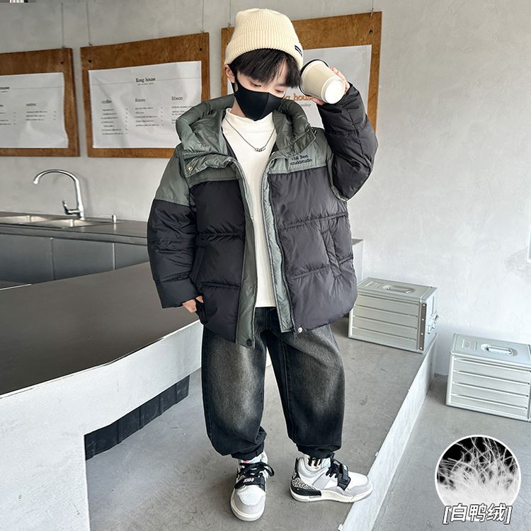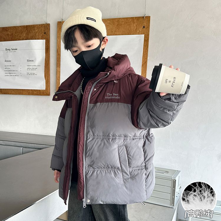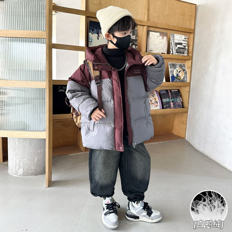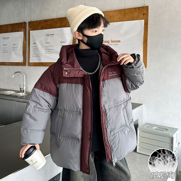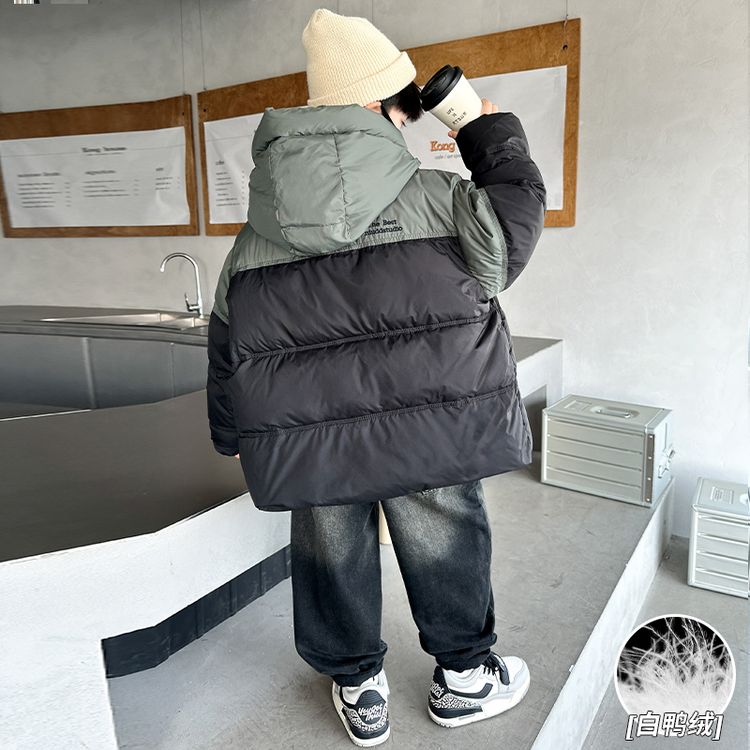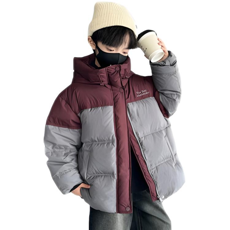 Детский пуховик с контрастными вставками и вышитыми буквами для мальчиков школьного возраста. Модель свободного кроя с утепленной подкладкой обеспечивает тепло, комфорт и стильный внешний вид в холодное время года.