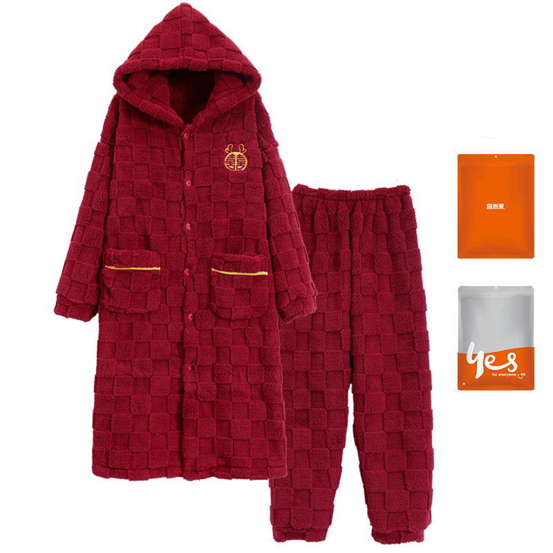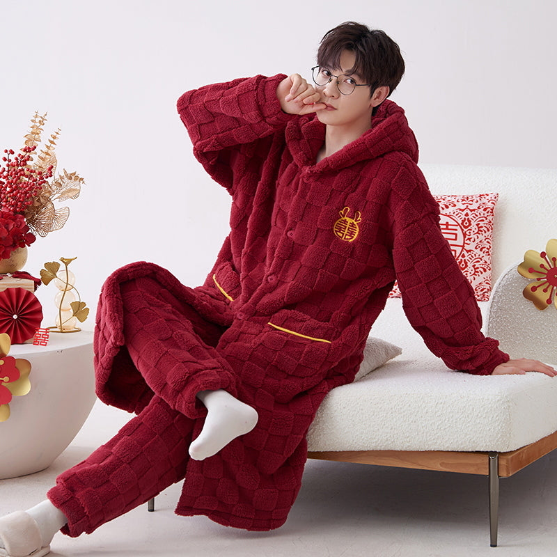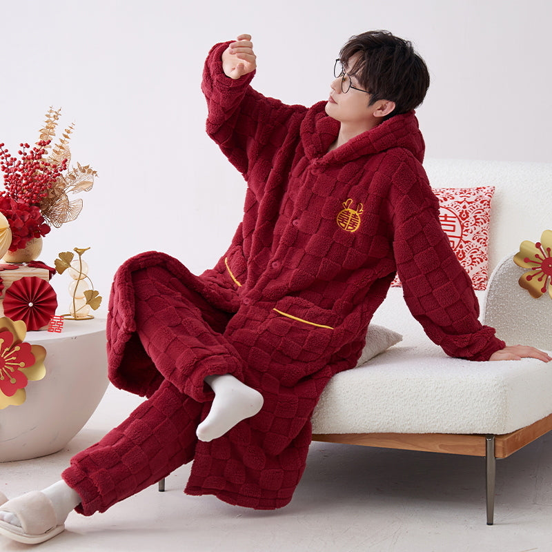 Yumshoq, qulay matodan tikilgan issiq dam olish kiyimlari to'plami, shu jumladan kaputli kardigan va uzun shim. Ushbu erkaklar to'plami uyda kiyish uchun qulay va kundalik kiyim uchun juda mos keladi.